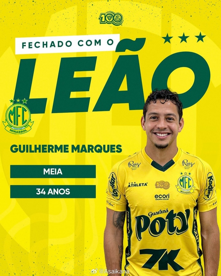 巴甲联赛球队米拉索尔(Mirassol-SP)官方宣布签下了此前在长春亚泰效力的巴西球员吉列尔梅(Guilherme Costa Marques)。现年34岁的吉列尔梅曾两次来华,分别效力于广州城、长春亚泰。2024赛季在亚泰效力期间遭遇十字韧带重伤,因而淡出一线队名单。他于今年4月伤愈复出,但未能继续留在亚泰效力。夏转期间最后时刻曾试图加盟另一支中超球队,但最终未能成行。