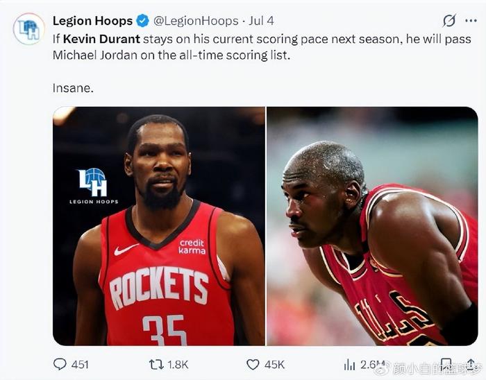 KD打SG将创纪录?美媒晒差1721分超乔丹:1数据历史唯一得分手