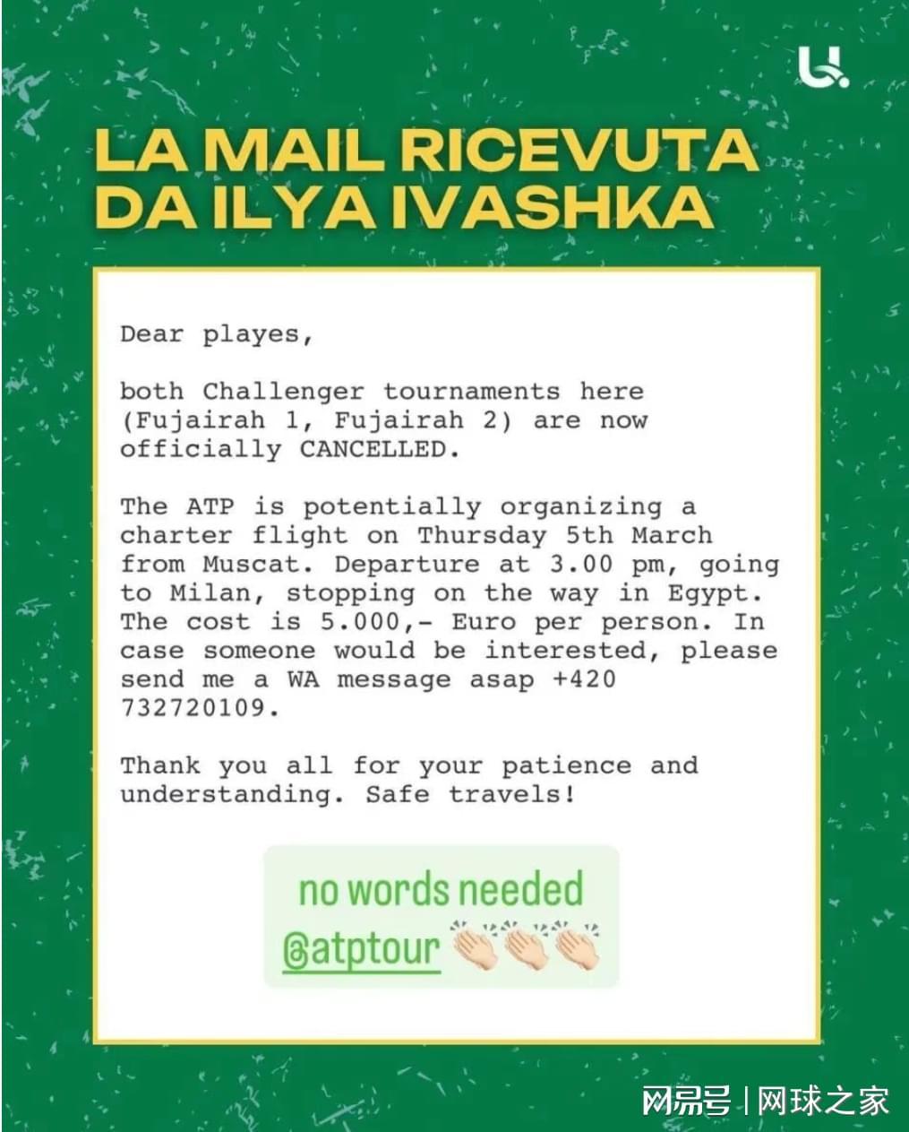 “刚收到确认,所有在富吉拉赛事的人员都将被免费撤离,所有费用由ATP完全承担,这波操作太赞了。” 伊利亚·伊瓦什卡在说这番话的时候非常开心,还刻意对ATP这么做送上了掌声。