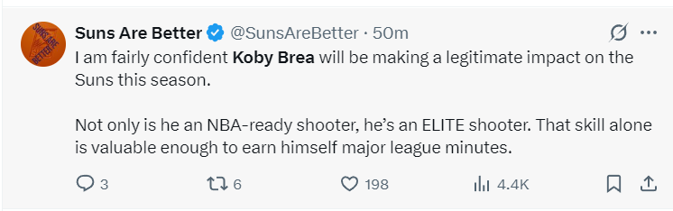 太阳媒体:我相当有信心,科比-布雷亚在本赛季会为太阳队带来实质性的贡献。他不仅是一名具备征战 NBA 赛场实力的射手,更是一位顶尖射手。单凭这一项技能,就足以让他获得顶级联赛的出场机会。